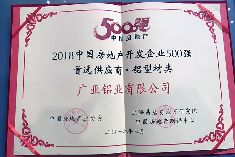 廣亞鋁業(yè)以全國鋁企前3甲,獲選房地產(chǎn)開發(fā)企業(yè)500強首選供應商。