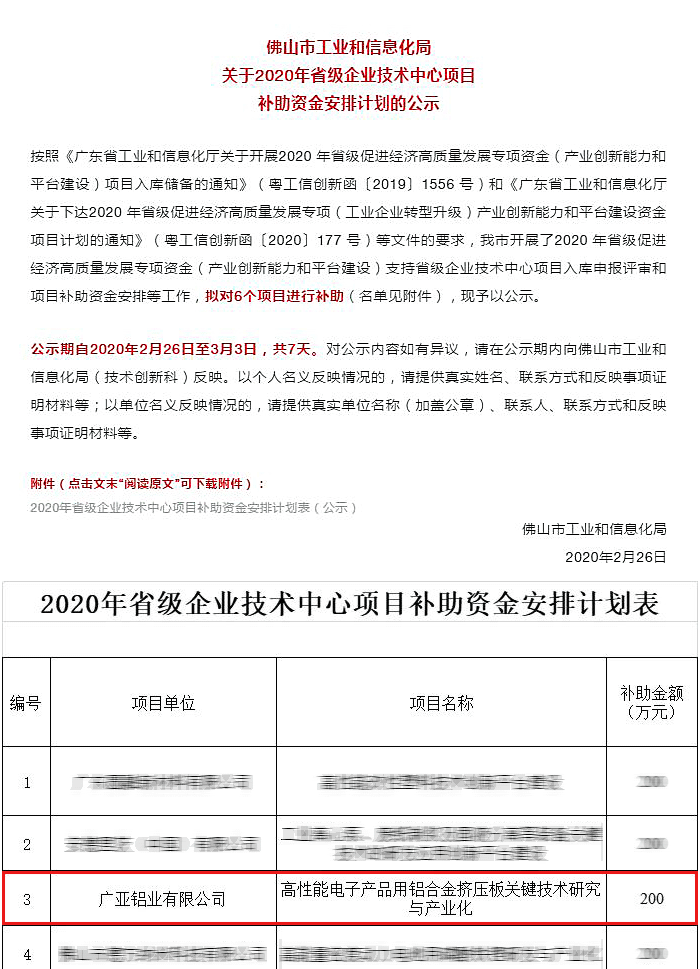 按照廣東省工信廳關(guān)于2020年省級促進(jìn)產(chǎn)業(yè)創(chuàng)新能力和平臺建設(shè)計劃的安排,佛山市開展了專項資金支持省級企業(yè)技術(shù)中心項目入庫評審和項目補助資金安排等工作。近日,廣亞鋁業(yè)《高性能電子產(chǎn)品用鋁合金擠壓板關(guān)鍵技術(shù)研究與產(chǎn)業(yè)化》項目喜獲補助資金200萬元,成為本輪獲補助的六家省級企業(yè)技術(shù)中心之一,且為我市鋁型材企業(yè)中唯一的一家。