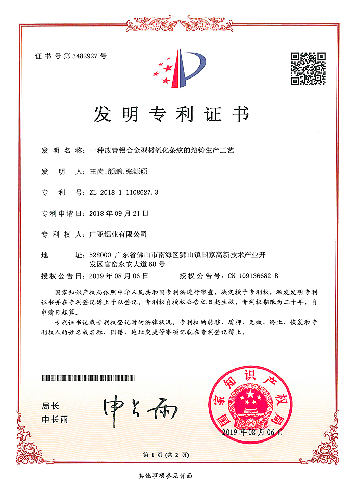 據(jù)悉,廣亞自2018年10月以來,在不到一年半的時間里,就先后申請了18項國家專利,包括發(fā)明專利8項,實用新型10項。其中《一種改善鋁合金型材氧化條紋的熔鑄生產(chǎn)工藝》已獲得發(fā)明授權(quán);《一種異型密封隔熱條》等7項已獲得實用新型授權(quán)。 |