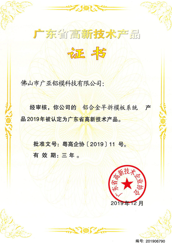 廣亞鋁業(yè)集團旗下廣亞鋁模六項產(chǎn)品獲廣東省高新技術(shù)產(chǎn)品認(rèn)定