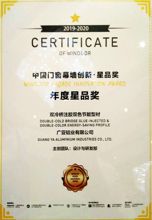 在當晚進行的中國門窗幕墻創(chuàng)新·星品獎頒獎典禮上,廣亞鋁業(yè)“雙冷橋注膠雙色節(jié)能型材”產(chǎn)品,從500多家候選企業(yè)產(chǎn)品中脫穎而出,一舉榮獲創(chuàng)新·星品獎。這也是該獎自2015年正式評選以來,廣亞鋁業(yè)第4次榮獲該獎。 雙冷橋注膠雙色節(jié)能型材采用了獨創(chuàng)專利技術:聚胺基甲酸乙酯(PU)和高強度玻纖強化尼龍(PA66GF25)雙重連接的創(chuàng)新結構,在這兩種隔熱材料的完美結合下,型材的強度可達到國標標準值的三倍以上,徹底解決了傳統(tǒng)注膠型材橫向抗拉強度低及高溫力學性能差、穿條型材縱向剪切強度及低溫力學性能不理想以及兩側隔熱穿條位易滲水的行業(yè)難題,并可輕易實現(xiàn)注膠型材大截面結構,實現(xiàn)了美式注膠節(jié)能技術和歐洲穿條節(jié)能技術的完美結合。