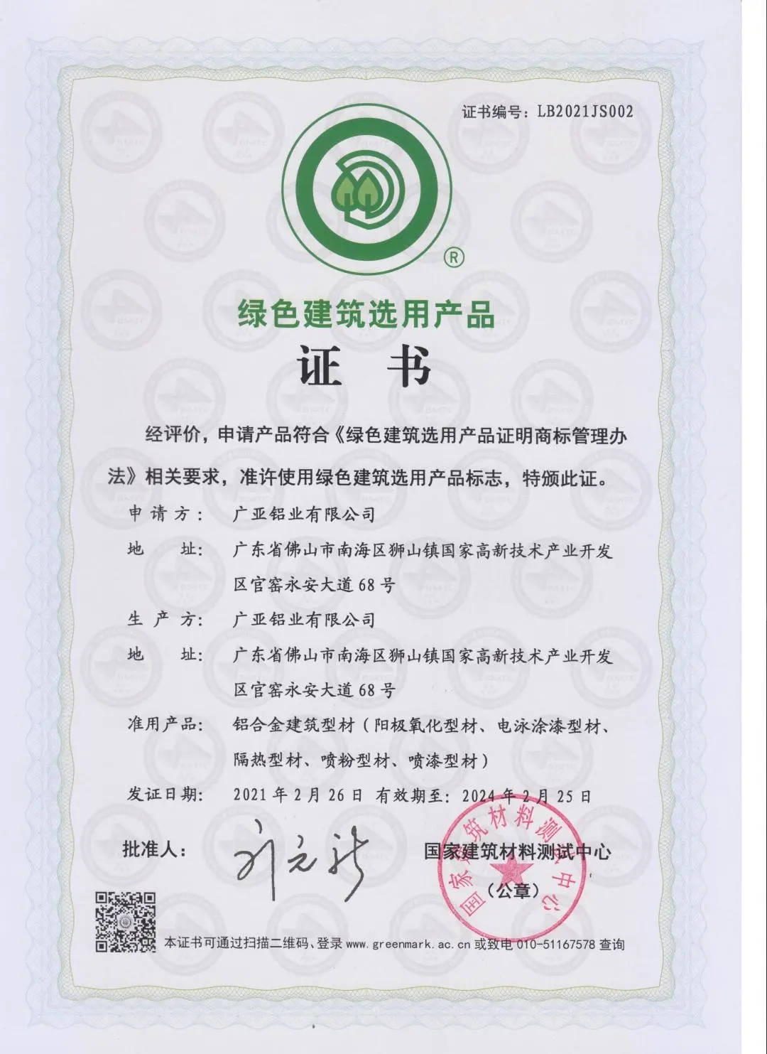 廣亞鋁業(yè)獲得此項認證,意味著響應國家“十四五”規(guī)劃提出“加快推動綠色低碳發(fā)展”“發(fā)展綠色建筑”,大力發(fā)展綠色建筑是廣亞新階段適應經(jīng)濟社會的轉(zhuǎn)型,智能制造方向的探索與轉(zhuǎn)型,用實