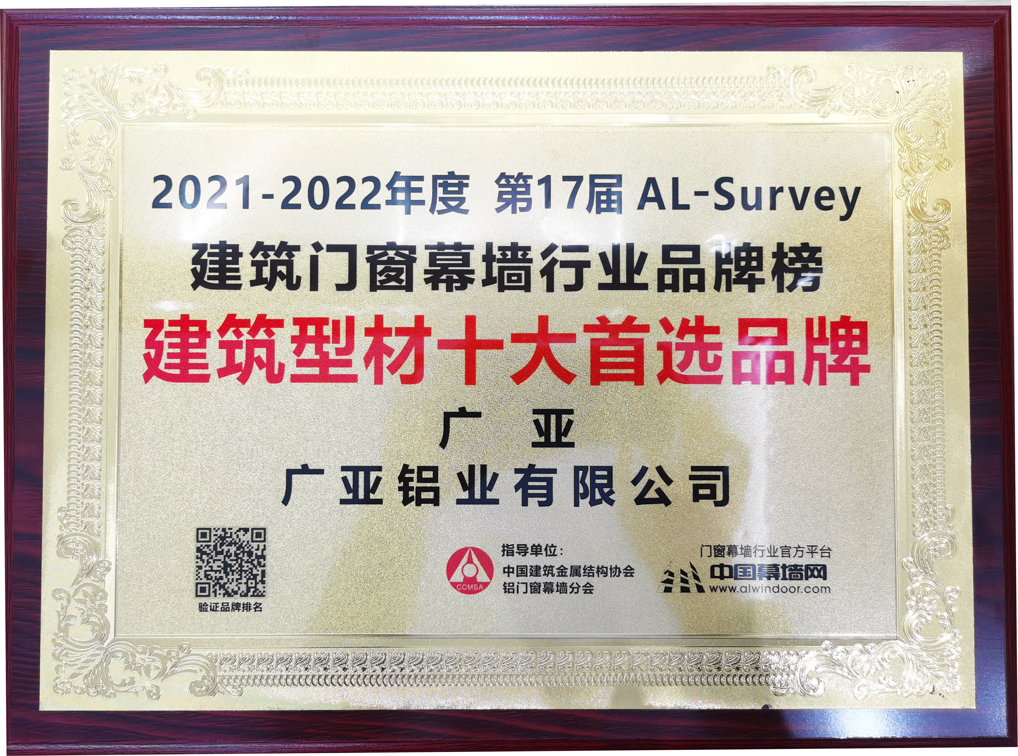 (簡稱“AL-Survey”)在廣州南豐國際會展中心隆重舉行。廣亞鋁業(yè)再次被評為“建筑型材十大首選品牌”,這是廣亞鋁業(yè)連續(xù)五年獲此殊榮!