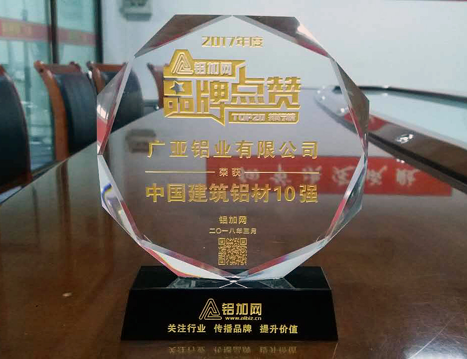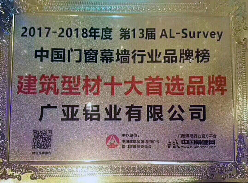 2018年3月10日,在展會開始前舉辦的第24屆全國鋁門窗幕墻行業(yè)年會暨2018中國建筑經(jīng)濟廣州峰會上,由中國建筑金屬結(jié)構(gòu)協(xié)會主辦,中國幕墻網(wǎng)(ALwindoor.com)承辦的中國門窗幕墻行業(yè)大型讀者調(diào)查活動暨“我最喜愛幕墻工程”評選活動頒獎禮如期舉行。廣亞鋁業(yè)在入圍的193家企業(yè)、18項幕墻工程中脫穎而出。榮獲中國建筑鋁型材十大首選品牌。據(jù)悉,該評選活動已連續(xù)成功舉辦了十三屆,始終堅持“沒有黑馬、實至名歸”的評選風格,已成為廣大房地產(chǎn)開發(fā)商、設(shè)計院以及行業(yè)專家、顧問咨詢公司等讀者群體進行品牌選擇和產(chǎn)品選購的重要參考依據(jù)。而每屆的“我最喜愛幕墻工程”評選,更是以“新、奇、高、大”的入圍標準,被喻為“魯班獎”的前哨站!